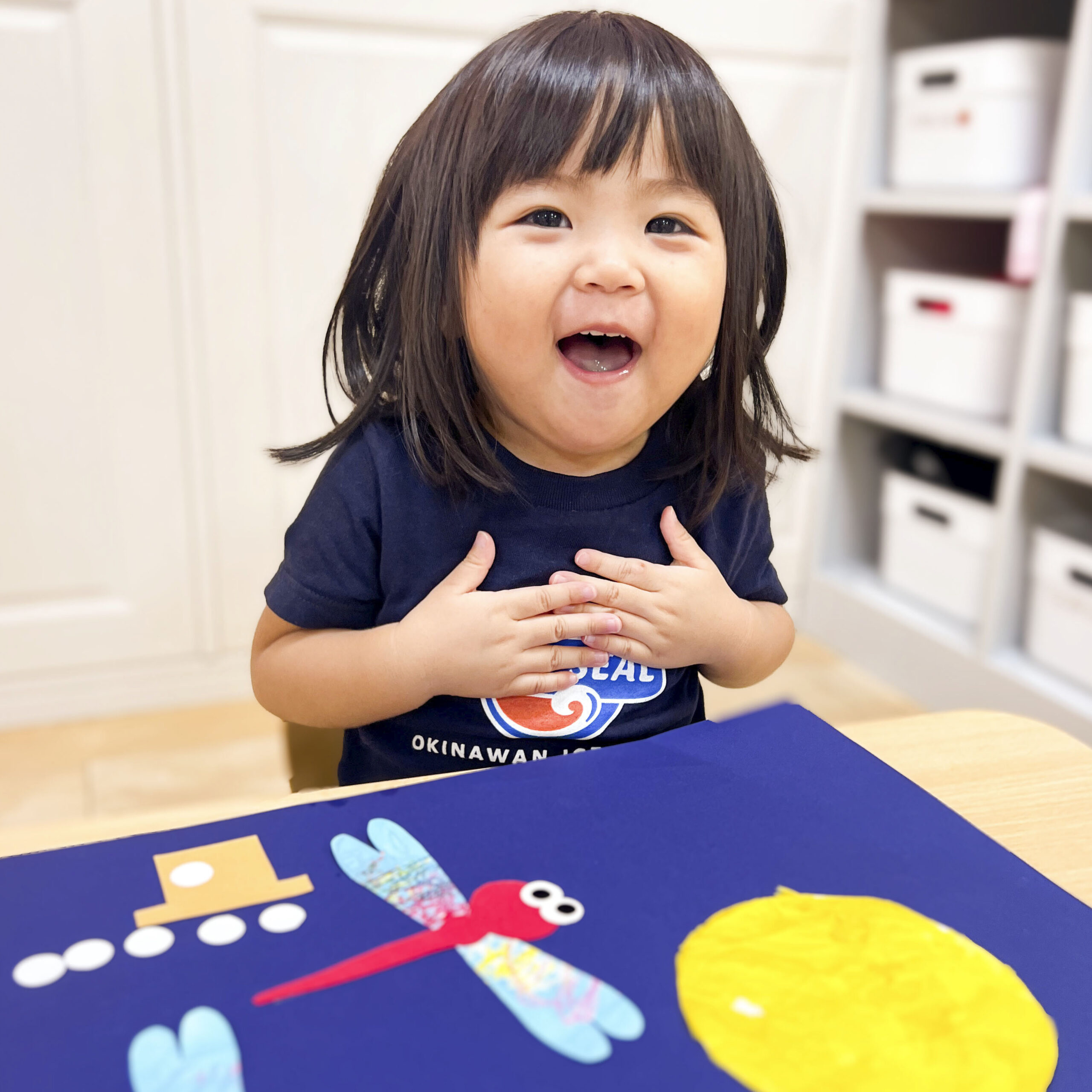 月は、お花紙でちぎって貼ったり、トンボの羽の部分は、クレヨンと絵の具を使った「はじき絵」で表現しています✨
