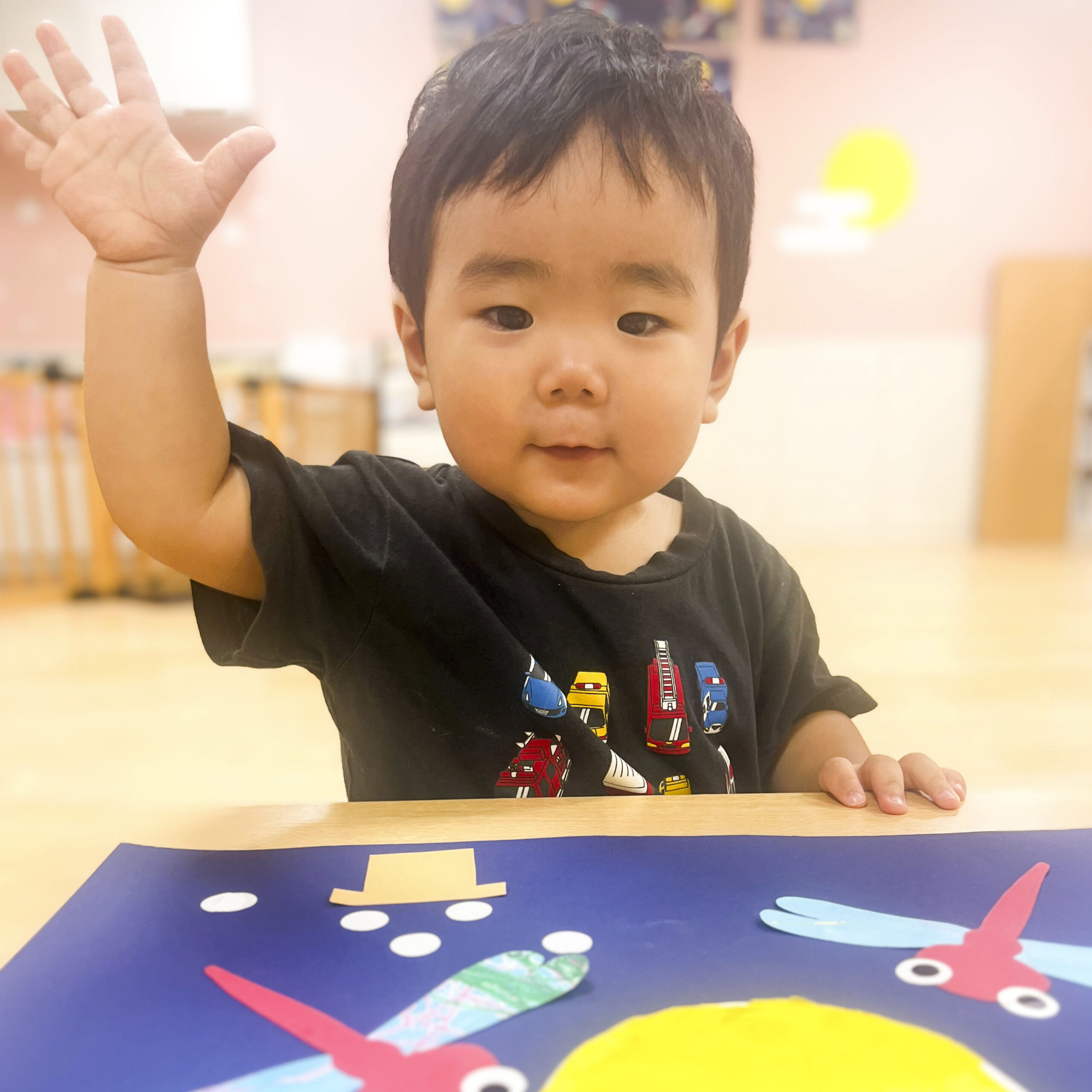 画用紙に作品を貼ると、はがれない様に小さな手でしっかりと押していきます🤗🤗