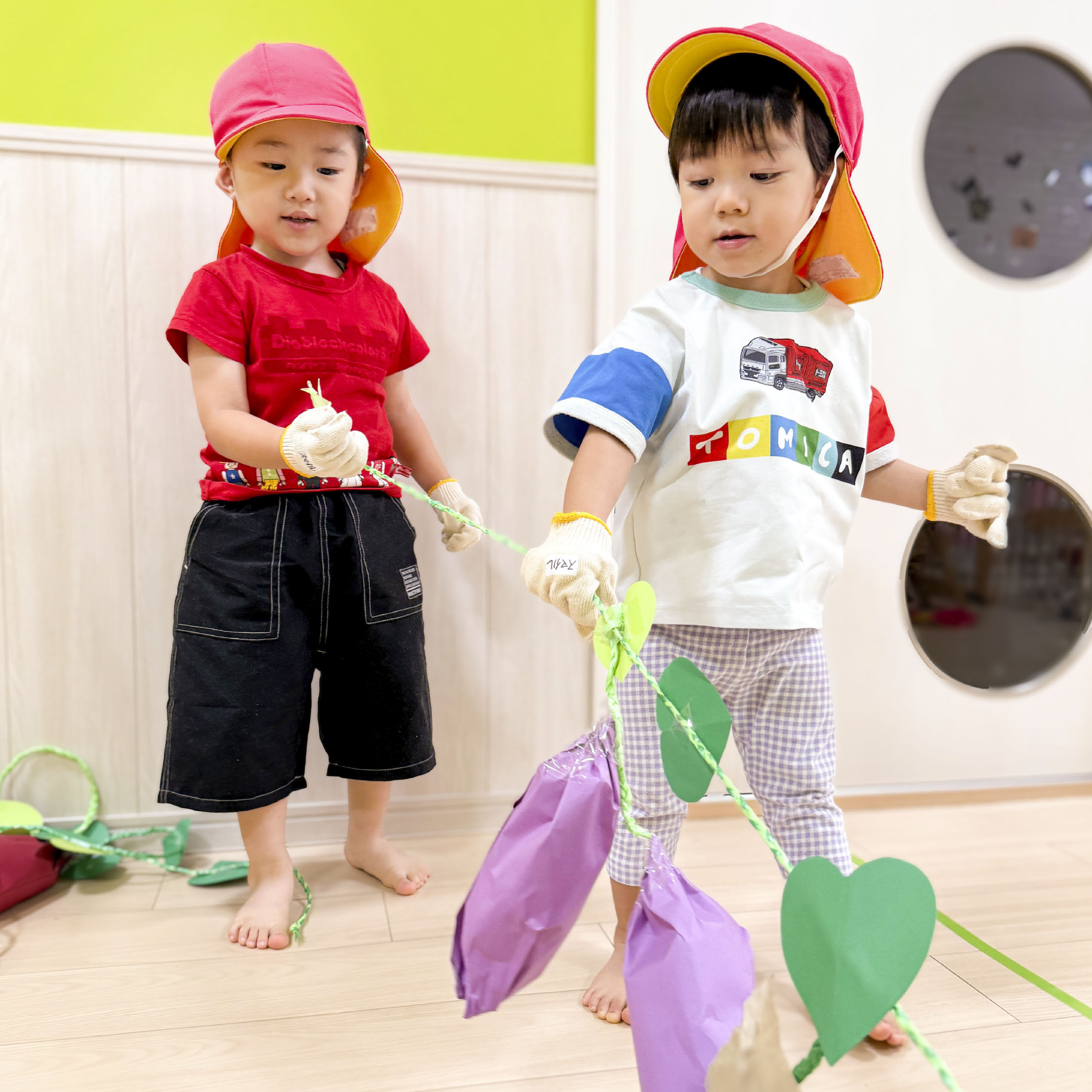 先生と一緒に「いもほりのうた」に合わせてお芋のつるを引っ張っていきます💪💪