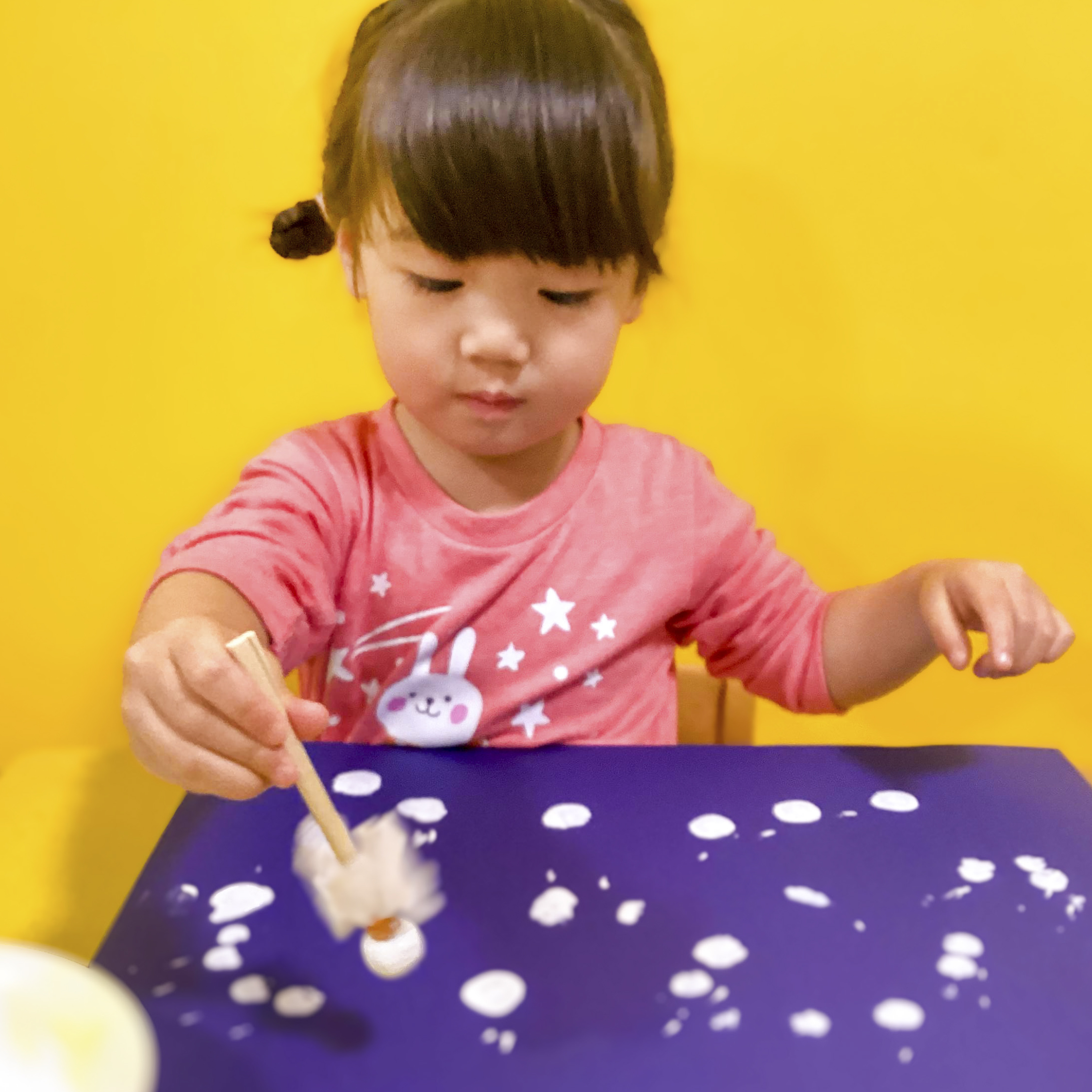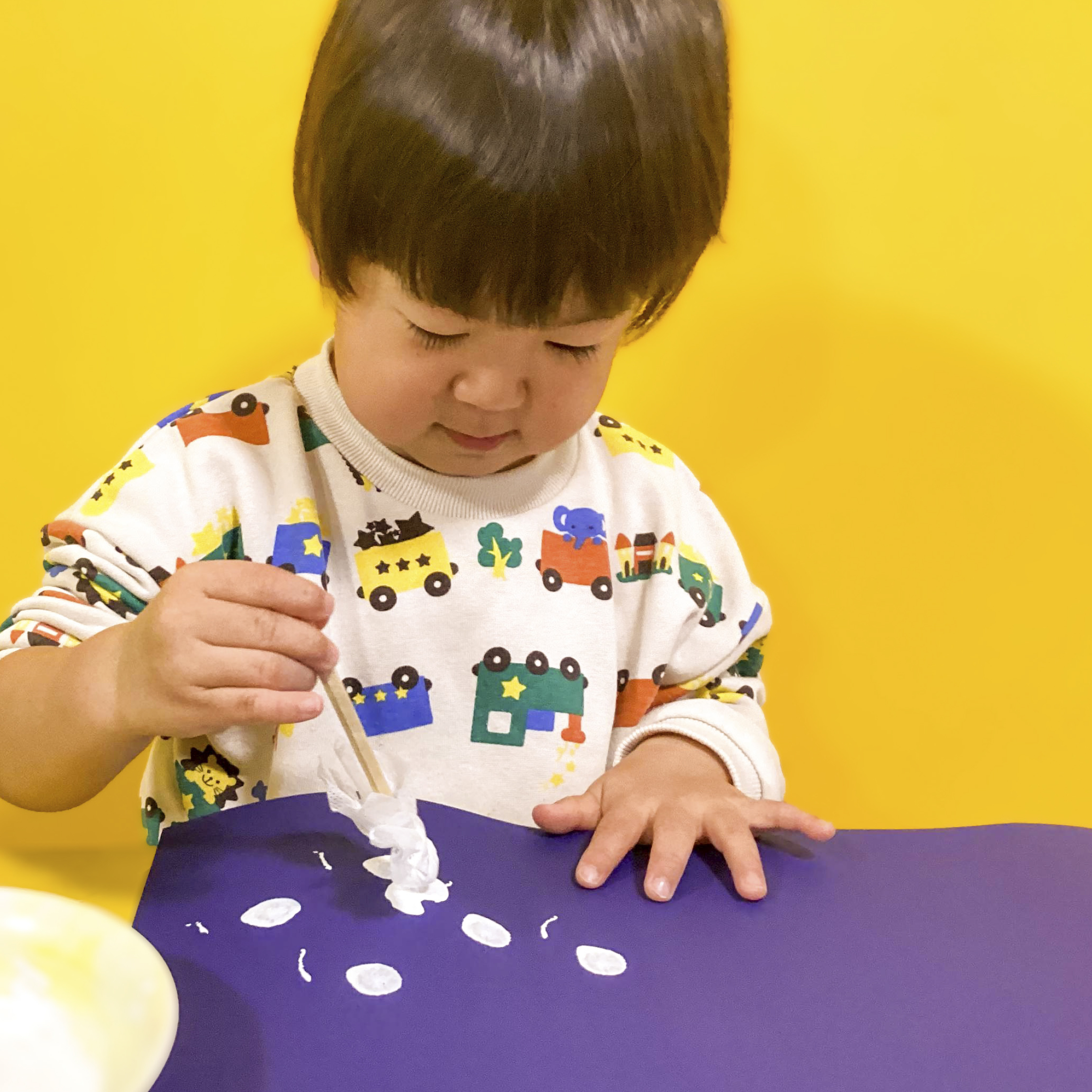 白い絵の具を付けたたんぽ(綿の筆)をスタンプを押すようにポンポンと押し当てていきます😉