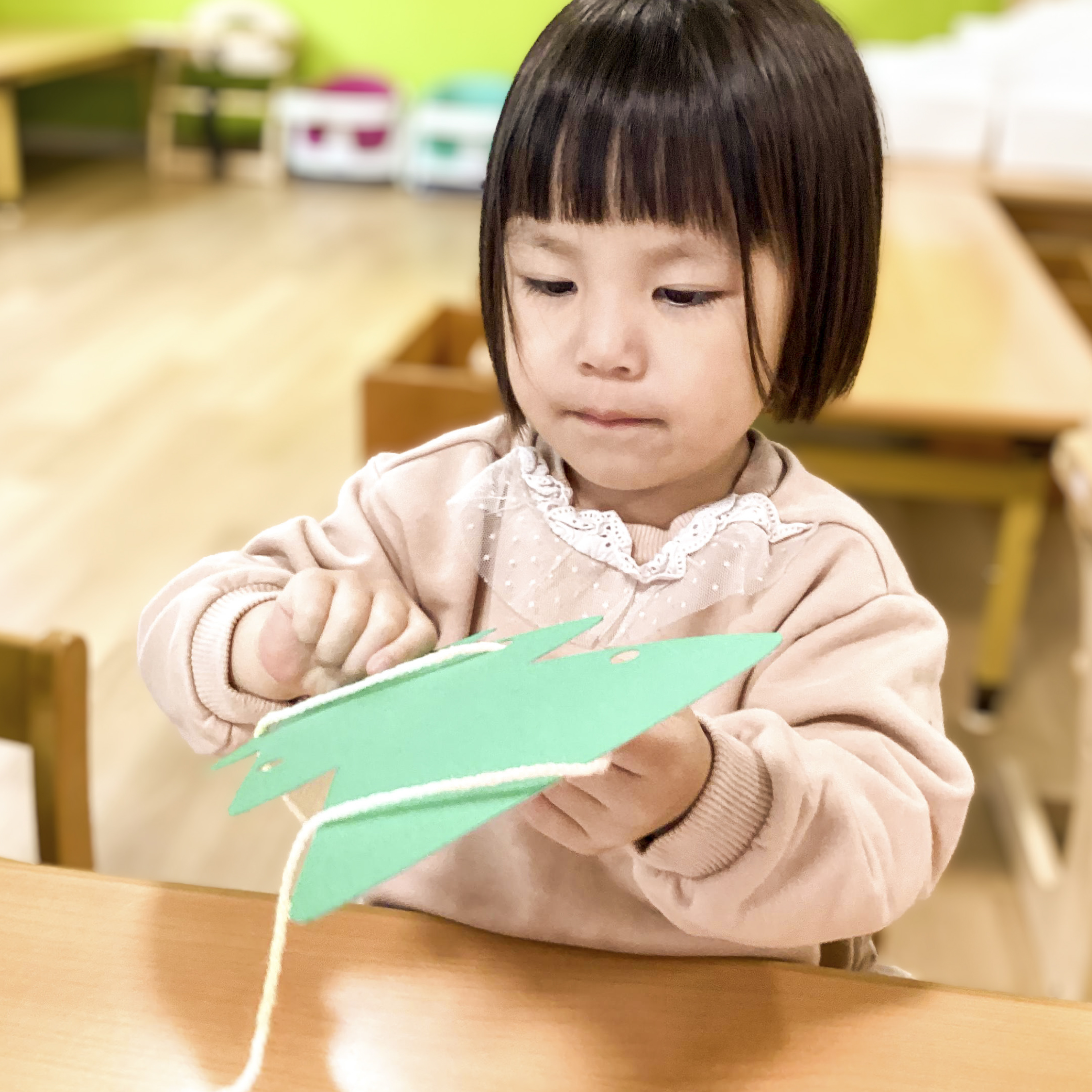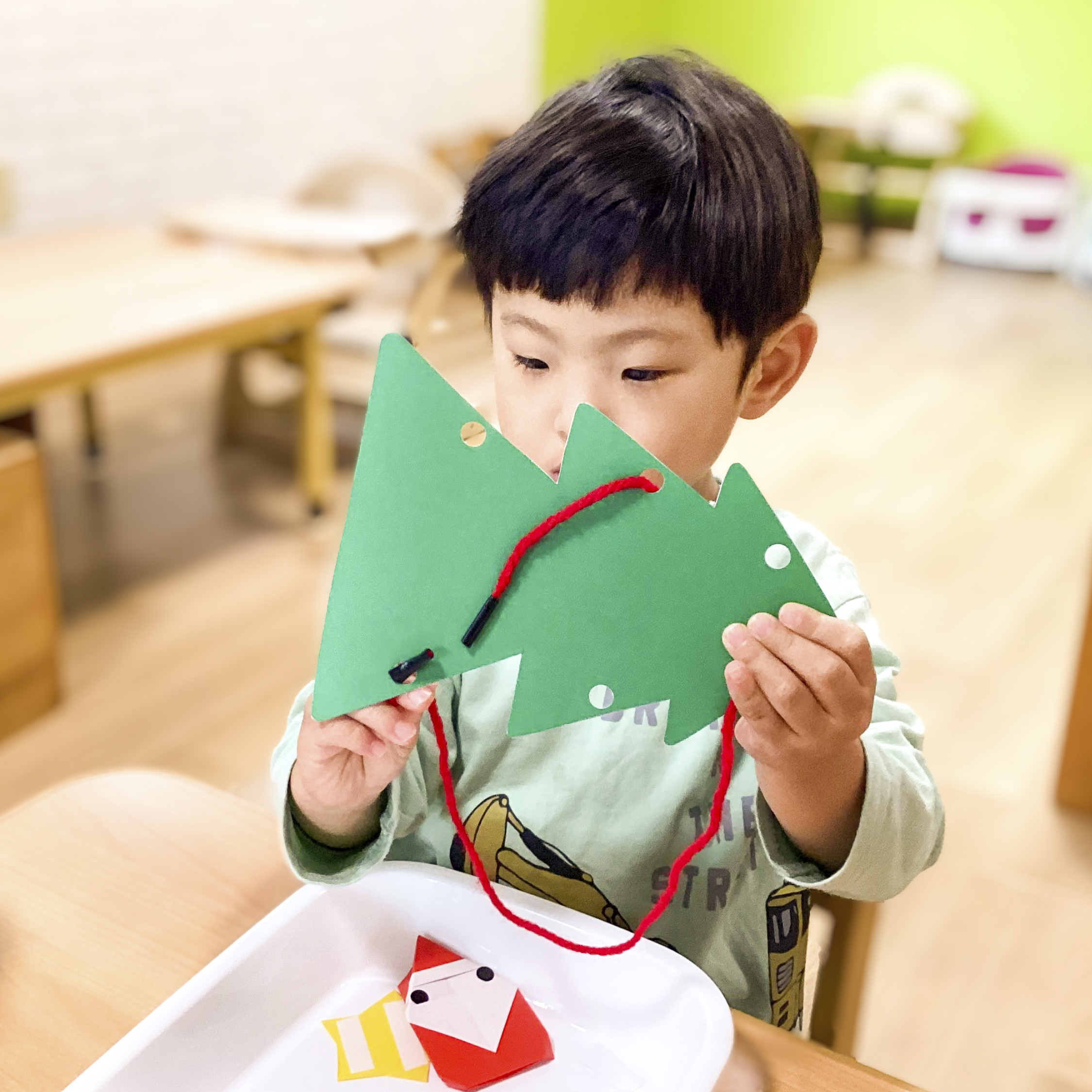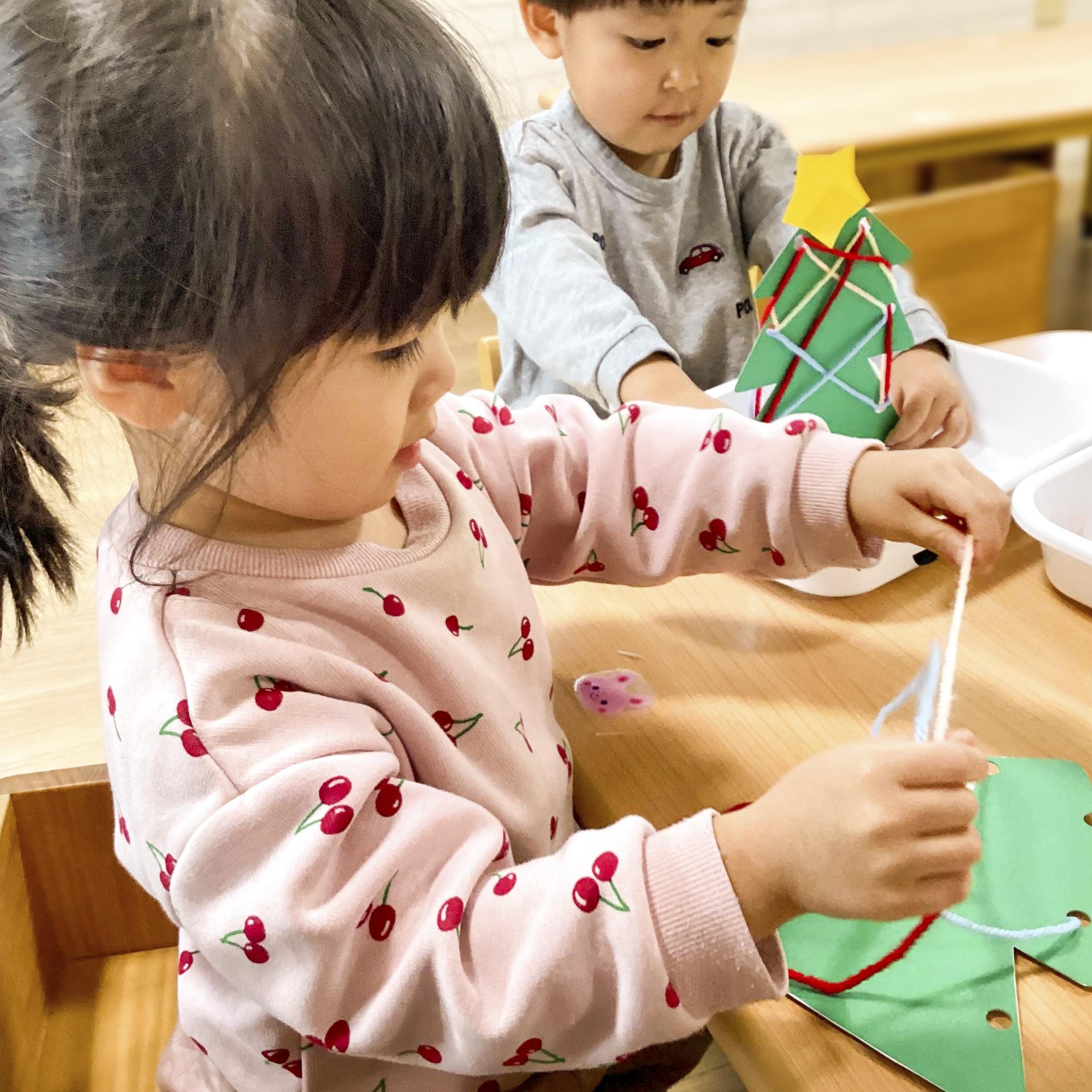 子どもたち自身が自由に様々な色の毛糸を通して素敵なクリスマスツリーの完成です🧑🎄👧