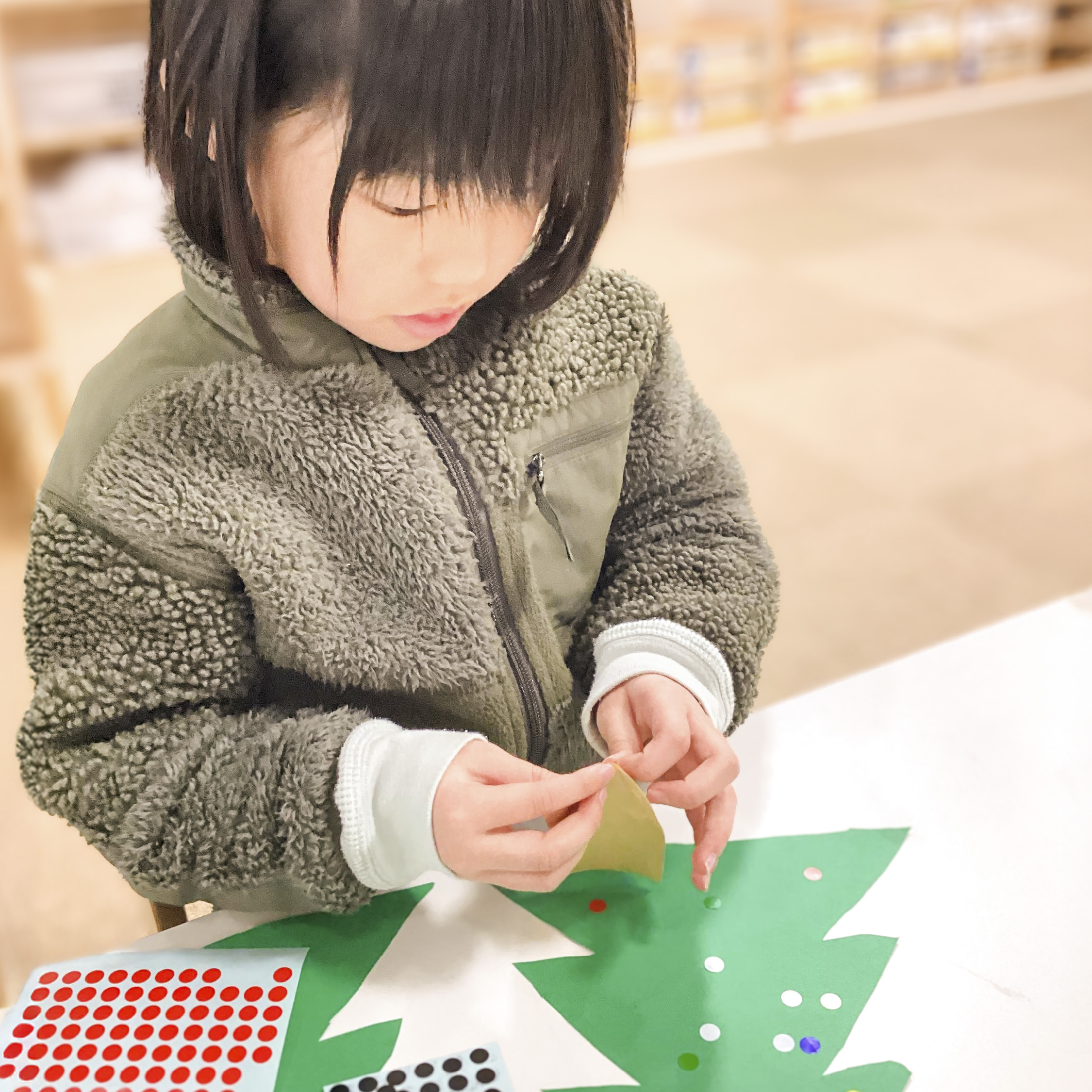 画用紙をツリーのように切った後は、カラフルなシールを貼ります✨